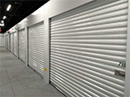 the door rolls into a coil at the top above the door opening. The sheet rolls down in a track to close the opening. These doors have very few moving parts and are not made for high use. Without special wind locks in the tracks, the sheet curtain can blow out of the guides in high wind. But they are an affordable door in occasional-use areas such as storage units.